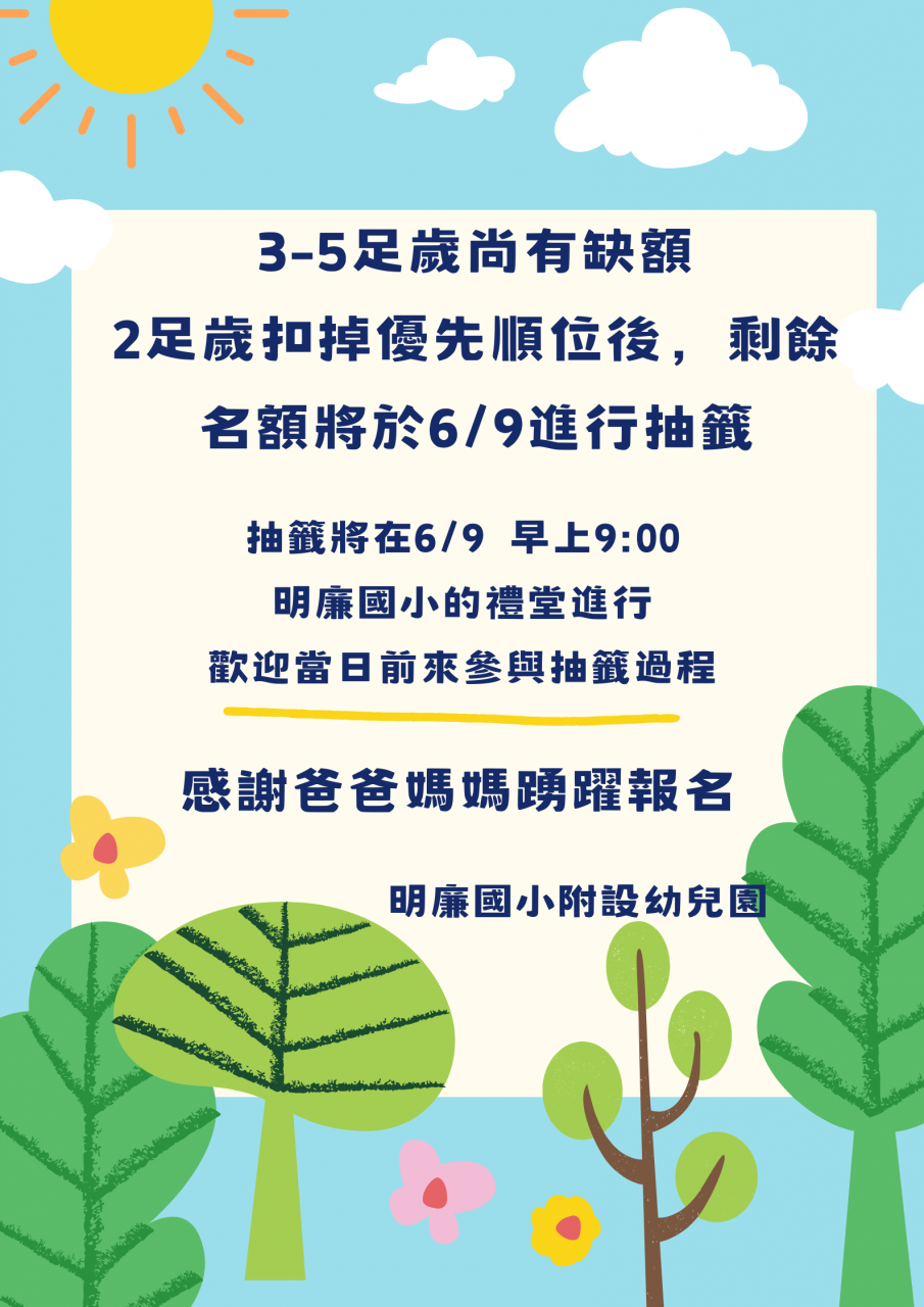 2 足歲寶貝,扣掉『花蓮縣公立幼兒園及非營利幼兒園招收需要協助幼兒優先入園辦法』訂定之優先順位後,剩餘 1 名名額(第四順位:其他幼生依一般生規定入園者)。將在 6 月 9 日 9:00 ,在明廉國小禮堂,進行抽籤